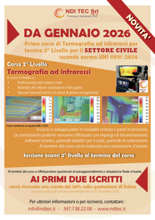 Abbiamo il piacere di comunicare che avvieremo a Gennaio 2026 il PRIMO CORSO DI TERMOGRAFIA PER IL SETTORE COSTRUZIONI CIVILI per la candidatura all'esame 2° LIVELLO secondo UNI 11931.